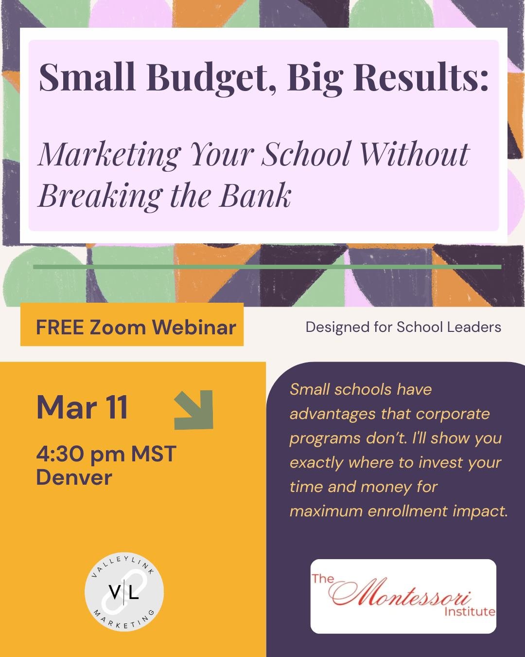Struggling to fill your preschool classes? Brought to you by The Montessori Institute, join Montessorian and school marketing strategist, Meg Trezise for a FREE 30-minute webinar where she will show you how to market your school effectively-even with a tiny budget.